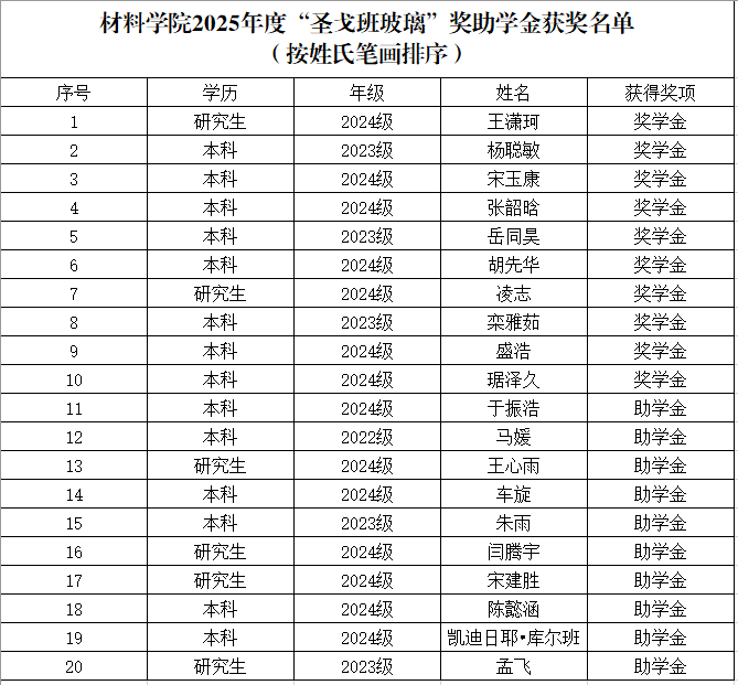 根据《关于评选材料科学与工程学院2025年度“圣戈班玻璃”奖助学金的通知》的相关要求,经个人申请、学院评选小组审核、现场答辩评审等环节,最终评选以下同学获得材料学院2025年度“圣戈班玻璃”奖助学金,现作公示,公示期:2026年4月22日-2026年4月24日。