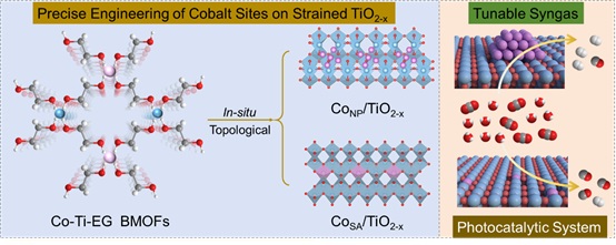 本研究以Co–Ti–EG双金属有机框架结构材料(Co–Ti–EG BMOFs)为反应前驱体,通过原位拓扑转化策略,成功构筑了具有原子级明确钴配位结构的位点特异性催化剂。该策略通过协同调控限域空间效应与基于精准螯合作用的金属离子缓释行为,实现了CoTiO3晶相、非化学计量TiO2-x基质,以及多种钴基活性中心——包括钴单原子(CoSA)和钴纳米颗粒(CoNP)——在富含氧空位且存在晶格应变的TiO2-x载体上的可控集成与空间定向构筑。性能测试表明,CoSA位点展现出优异的CO2选择性还原性能,5h内CO生成速率达329.0 μmol g⁻1;而CoNP位点则主导析氢反应(HER),在无牺牲剂条件下实现H2产率为123.7 μmol g⁻1。二者协同应变TiO2-x基质所赋予的高效电荷分离能力,共同实现了合成气(CO + H2)的高活性与宽范围可调输出,CO:H2摩尔比可在0.08–6.78区间精确调控。为突破水相体系中CO2溶解度低、反应动力学迟滞等关键瓶颈,本研究进一步引入共溶剂DMF,从而同步提升总产物的收率及拓宽合成气产物的比例范围。该研究工作结合理论计算与原位光谱表征,不仅系统阐明了性位点结构与催化性能之间的构效关系,也为多功能、高选择性光催化体系的理性设计提供了新思路,有望为推动二氧化碳资源化利用可控化、定制化方向发展奠定重要科学基础。
