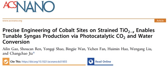 近日,我校材料学院贾长超副教授团队提出了一种创新性策略,即通过原位拓扑转化Co–Ti–EG双金属MOF前驱体,在应变TiO2-x基底上构建了明确的钴活性位点,实现了合成气组成的精确调控。该研究成果以“Precise Engineering of Cobalt Sites on Strained TiO2-xEnables Tunable Syngas Production via Photocatalytic CO2and Water Conversion”为题,发表于材料/纳米科学领域一区TOP期刊ACS Nano上(IF=16.1),相关链接:https://doi.org/10.1021/acsnano.6c01855。本研究以青岛科技大学为唯一通讯单位,贾长超副教授为唯一通讯作者。