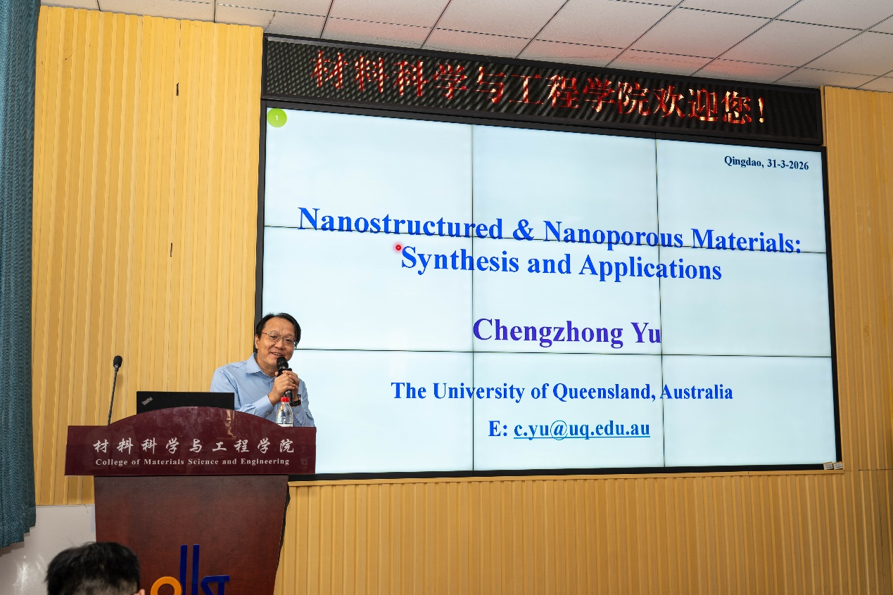 2026年3月31日下午15:00,应青岛科技大学材料科学与工程学院陈德宏教授邀请,澳大利亚昆士兰大学教授、博士生导师余承忠博士莅临我校四方校区,在材料学院101会议室作题为“Nanostructured & Nanoporous Materials: Synthesis and Applications”(纳米结构与纳米多孔材料的合成及其应用)的高水平学术报告。报告由学院院长李桂村主持,学院相关领域师生100余人到场聆听、交流。