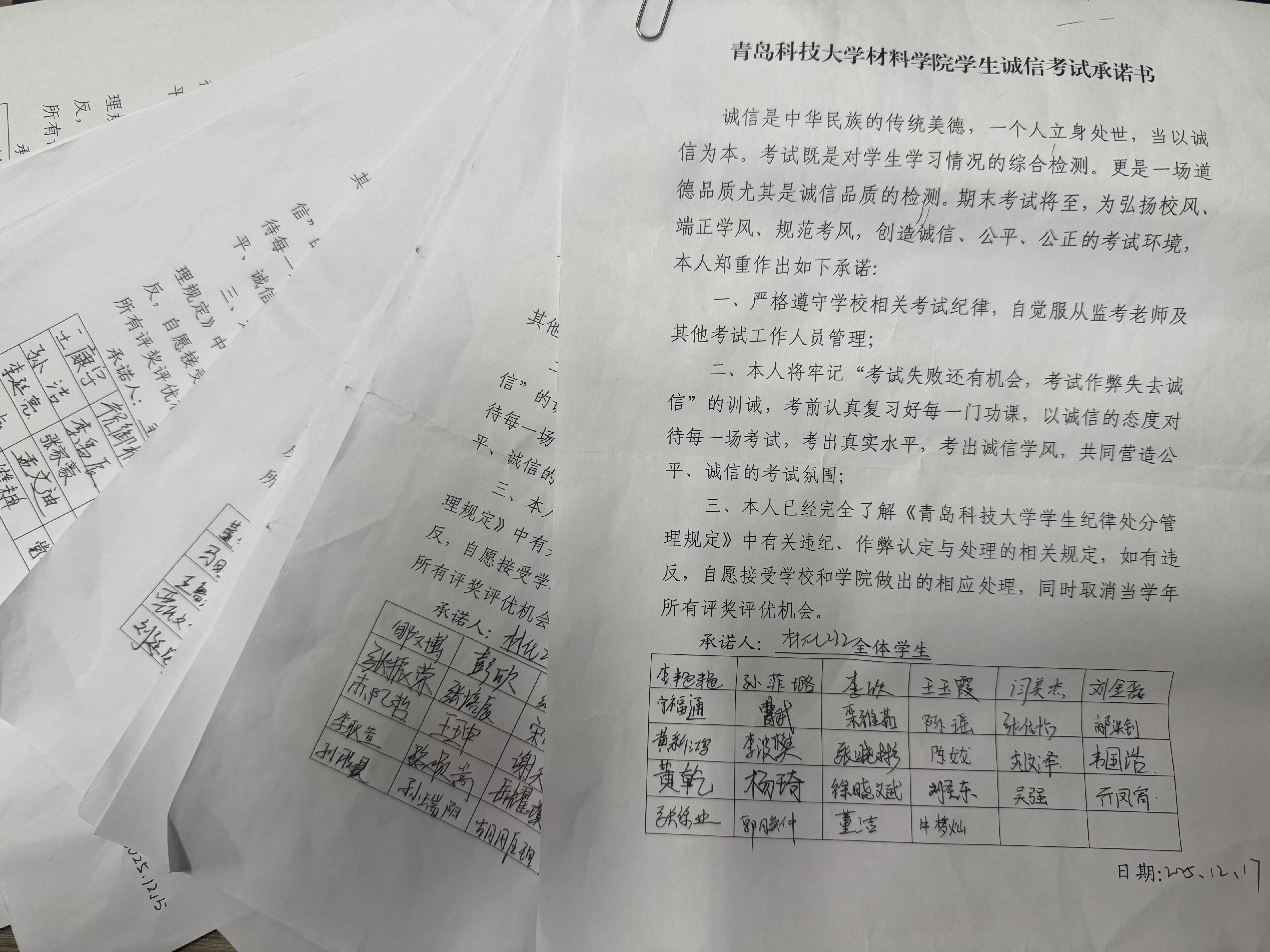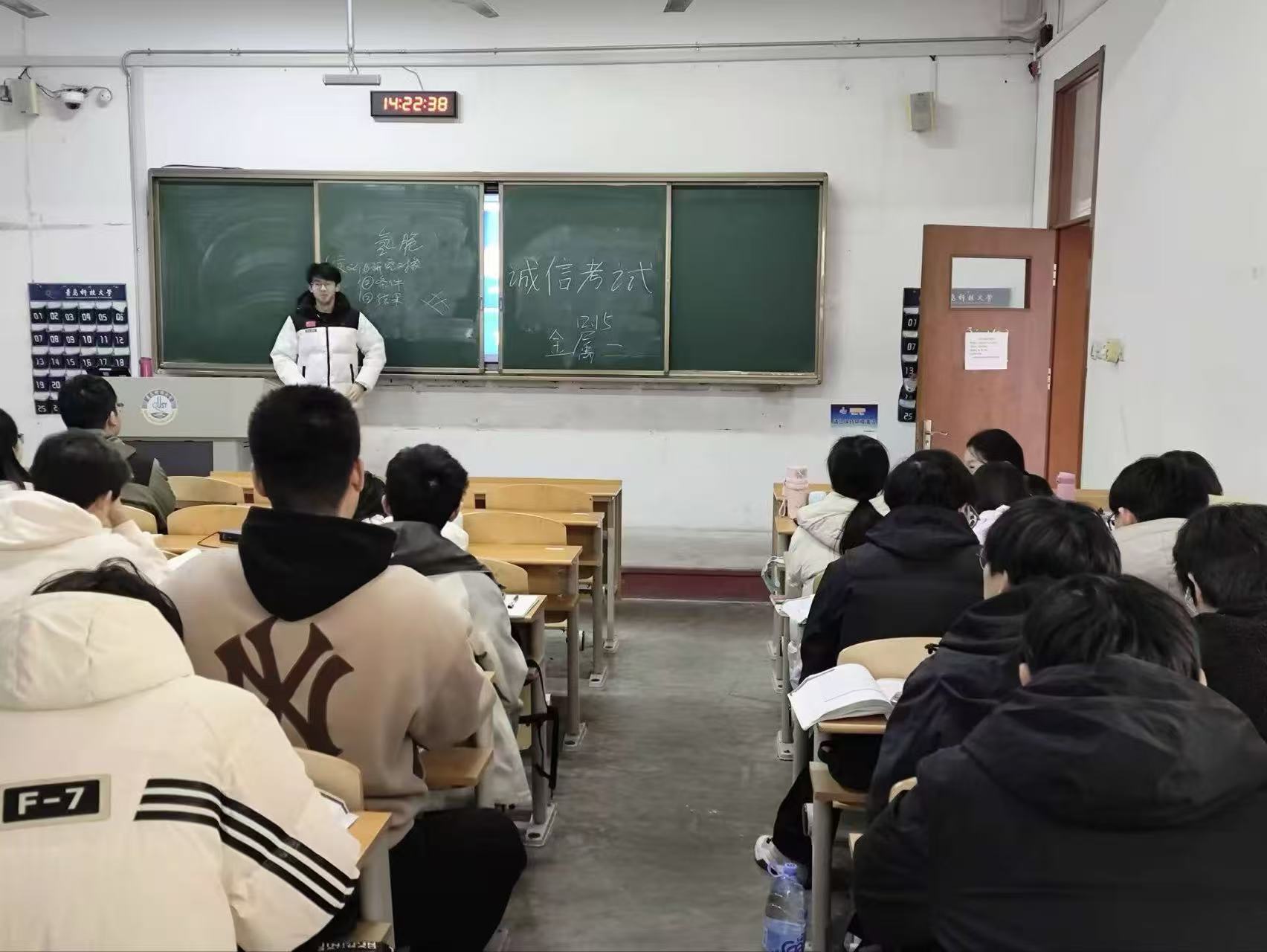 各班级班长须切实履行职责,主持召开班级诚信考试主题教育班会,将学校与学院的纪律要求传达至每一位同学,并统一组织全体同学现场签署《诚信考试承诺书》,以实际行动践行诚信诺言。